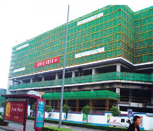 (1)腳手架外側防護須使用合格的密目式安全網封閉。外架上應設置公司標志(“公司”橫幅)和宣傳標語。保證外架協調美觀,體現企業特色。